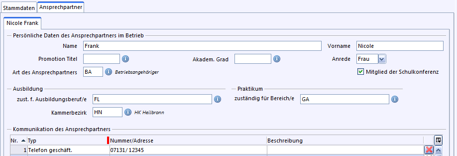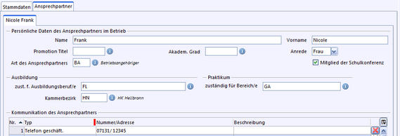 Sobald ein zusätzlicher Ansprechpartner aufgenommen wird, muss u. U. beim Schüler im Reiter Ausbildung eine neue Zuordnung zum Betrieb/Ansprechpartner vorgenommen werden.