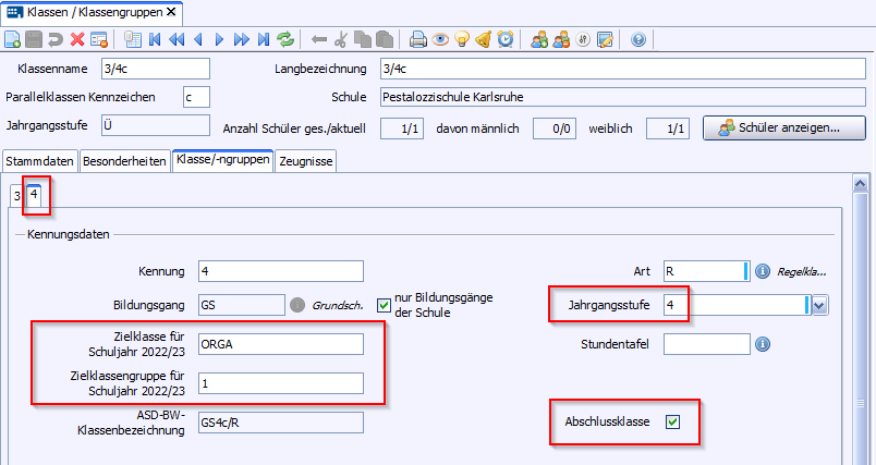 Eine neue Klassengruppe ist angelegt und bis auf die Kennung mit den bisherigen Daten vorbelegt.