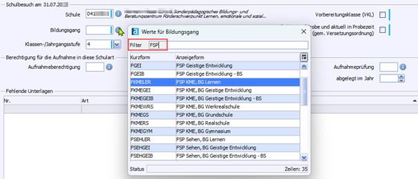 Auf diesem Reiter werden der aktuelle und alle vergangenen besuchten Bildungsgänge dokumentiert. Dieses können bei beruflichen Schulen verschiedene aufeinander folgende oder getrennte Bildungsgänge sein, z.B. BK1 und BK2. Oder bei allgemein bildenden Schulen bei einer GMS alle drei möglichen Bildungsgänge (GMSP; GMSSI & GMSSII).