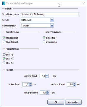 >Geben Sie zuerst einen Schablonennamen ein und nehmen Sie die Seiteneinstellungen vor. Mit Klick auf OK gelangen Sie zum eigentlichen Serienbriefgenerator.
